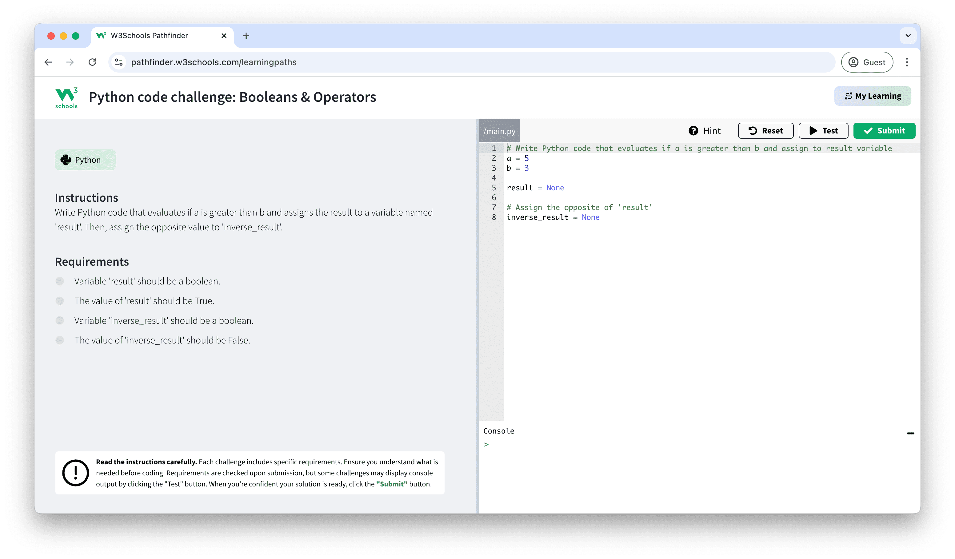 W3Schools Academy offers two types of activities: Challenges and Projects.