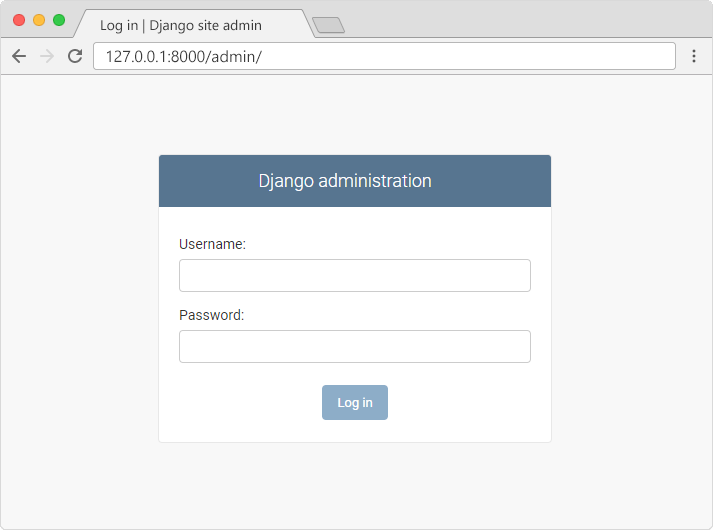 In the browser window, type 127.0.0.1:8000/admin/ in the address bar.