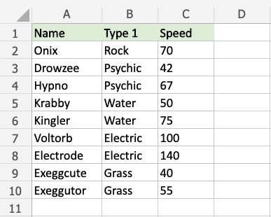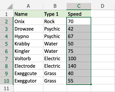 Now, all of the Speed value cells have a green bar showing how big the value is compared to the other values in the range: