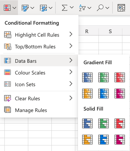 Data Bars are premade types of conditional formatting in Excel used to add colored bars to cells in a range to indicate how large the cell values are compared to the other values.