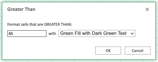 Now, the cells with values greater than "65" will be highlighted in green: