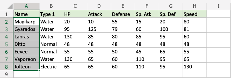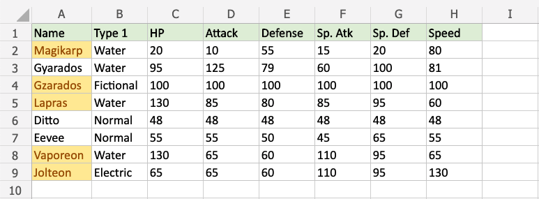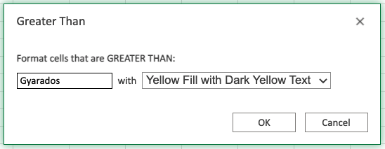 Now, the cells with text values later in the alphabet than "Gyarados" will be highlighted in yellow: