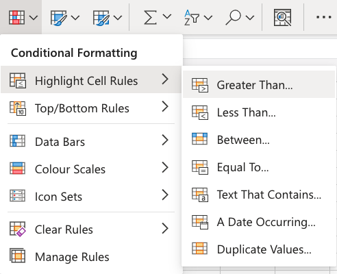 Here is the Highlight Cell Rules part of the conditional formatting menu: