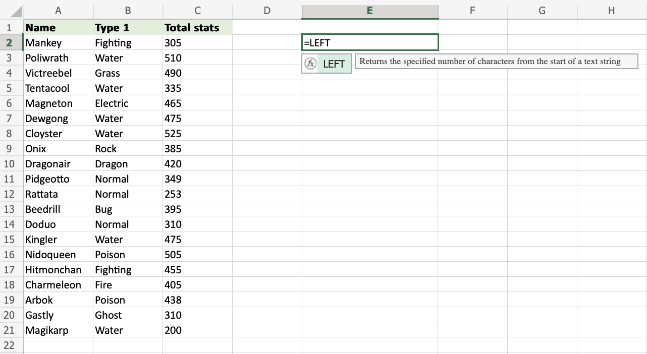 The LEFT function is used to retrieve a chosen amount of characters, counting from the left side of an Excel cell. The chosen number has to be greater than 0 and is set to 1 by default.