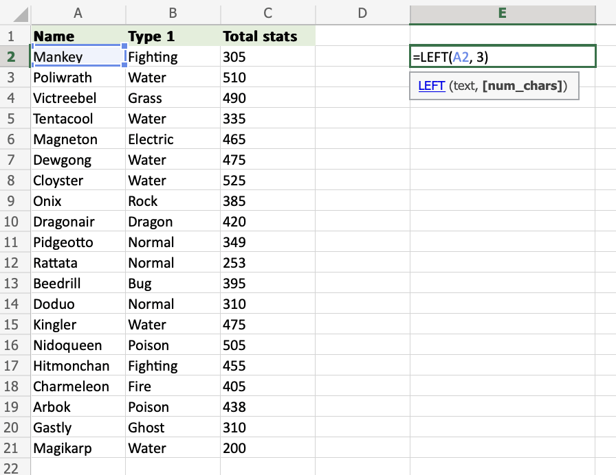 1. Enter the cell name (A2) and define the length of characters you want to retrieve, using a , as a delimiter (A2,3)
