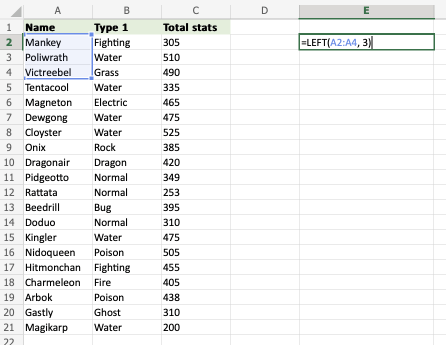 1. Select the cells (A2:A4) and define the length of characters you want to retrieve, using a , as a delimiter (A2:A4,3)
