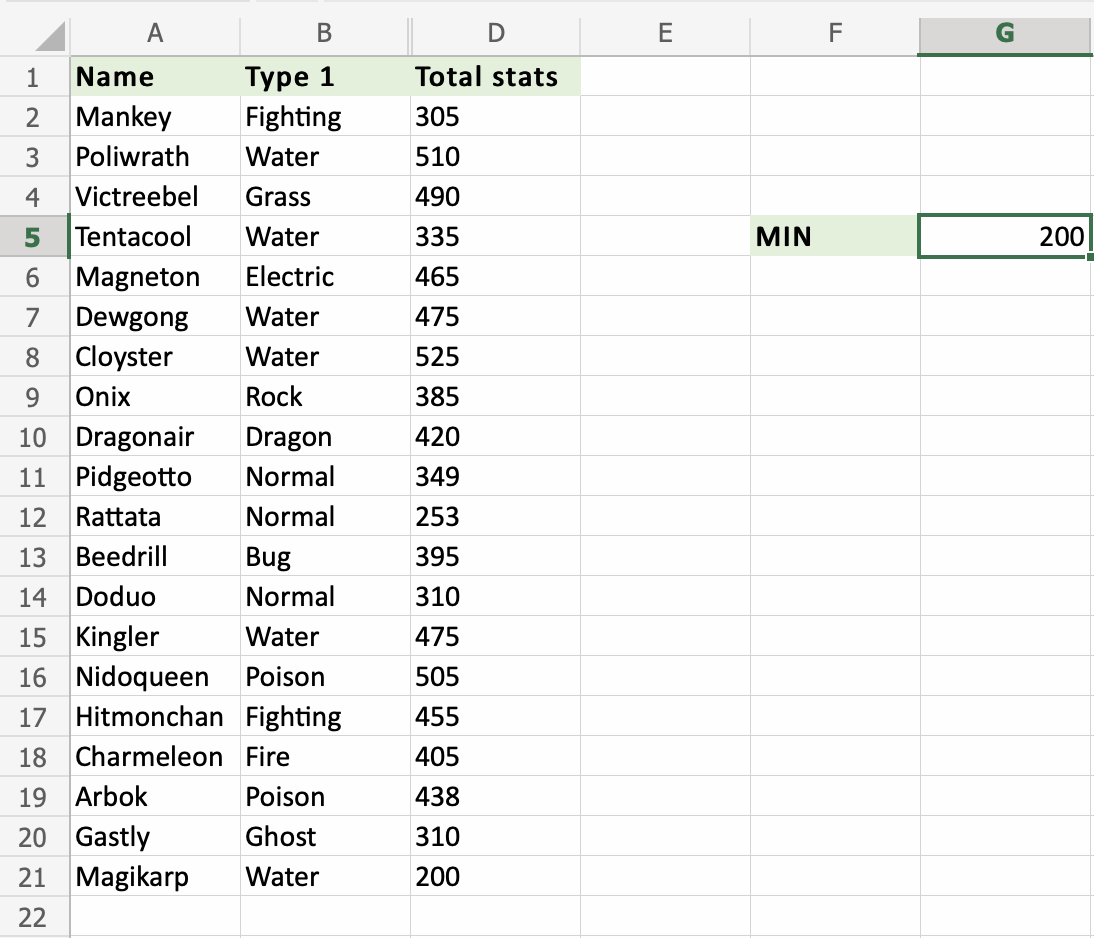 Look at that! The function has successfully found the lowest value, 200. Magikarp has the lowest Total stats of the Pokemons in the range D2:D21.
