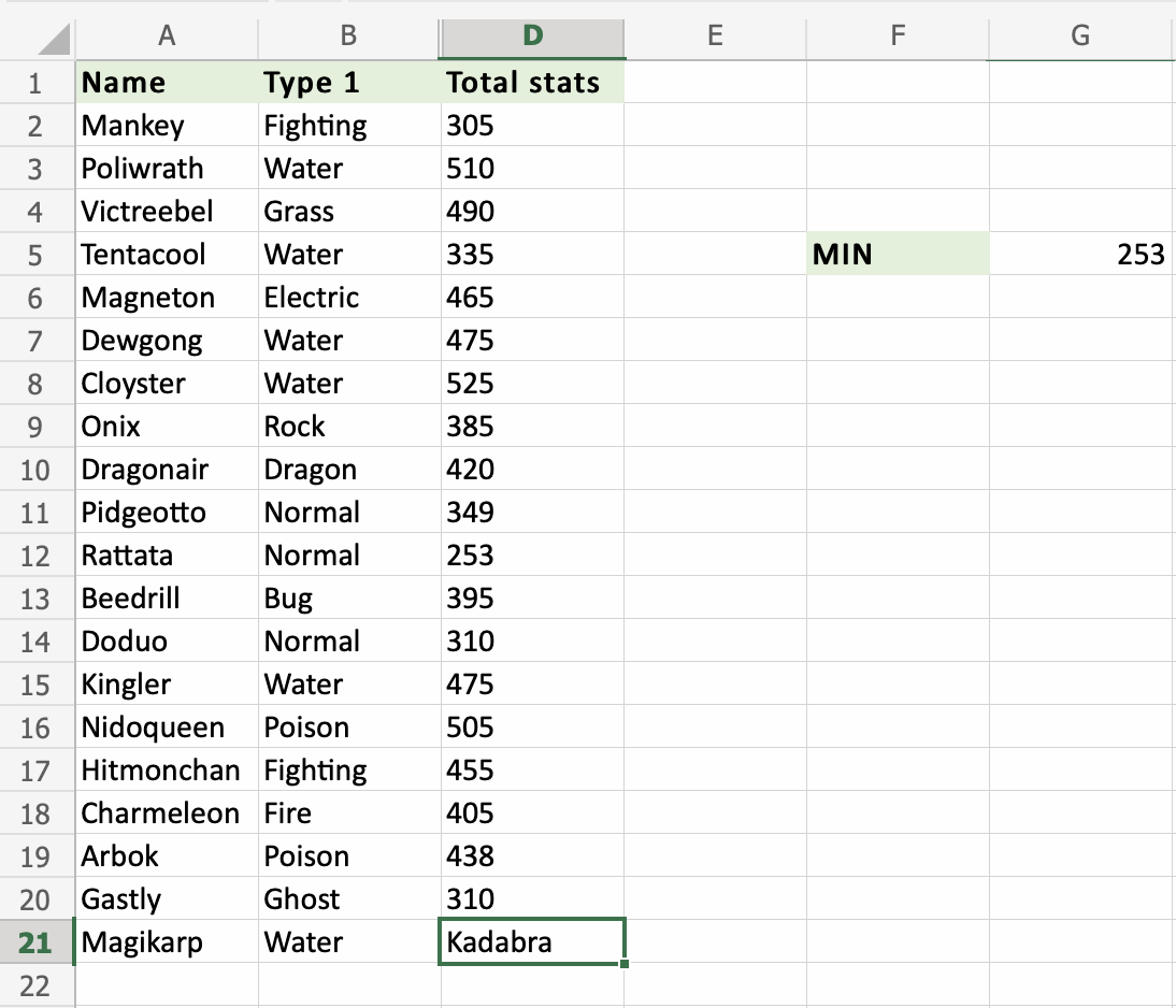 Right on! The function ignores the text typed in the range. 253 is returned as the new lowest value, as the old one was replaced with text. Rattata is now the Pokemon with the lowest Total stats in the range D2:D21.
