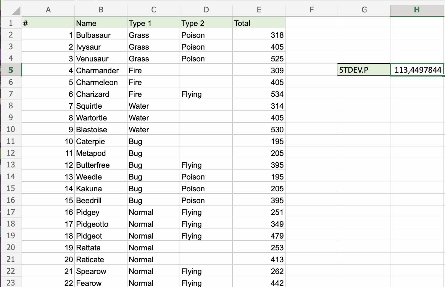 Find the Standard Deviation of Pokemon total stats in the range E2:E755: