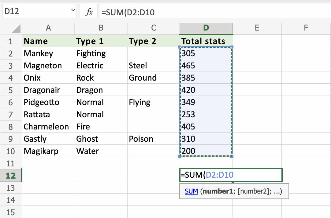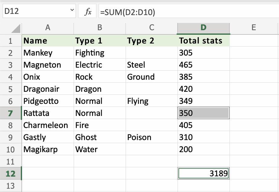 Great job! You have successfully calculated the sum of the stats using the =SUM function. The Pokemon's stats have a total sum of 3092.