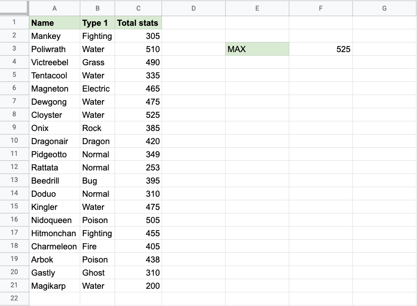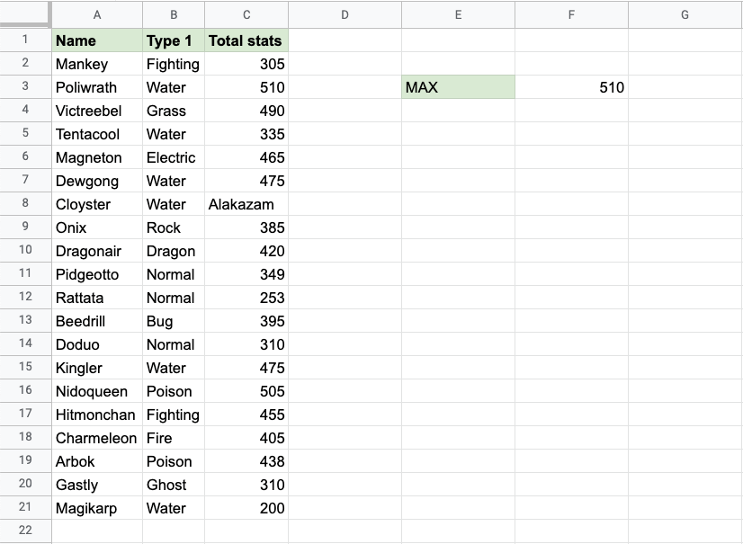 Nice going. The function ignores the text typed in the range. 510 is returned as the new highest value, since the old one was replaced with text. Poliwrath is now the Pokemon with the highest Total stats in the range C2:C21.