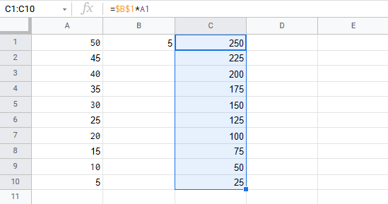 You got it! You have successfully used absolute reference to multiply B1(5) with the range A1:A10.
