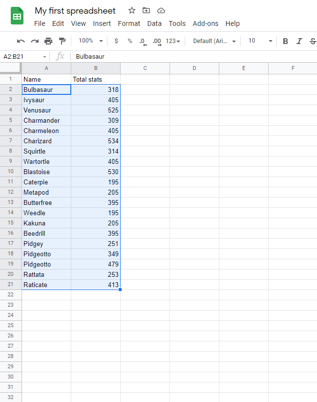 Sort the Pokemon in the range A2:A21 by their Name, ascending from smallest to largest (A-Z).