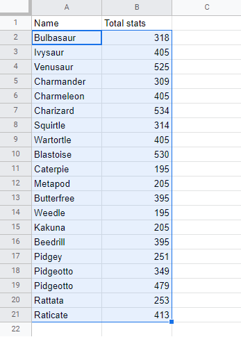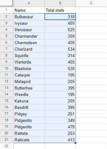 In this example we have two columns with related data. Column A is the Pokemon Names and Column B is their Total stats. Try sorting just one of the columns (A2:A21) ascending by their Names.