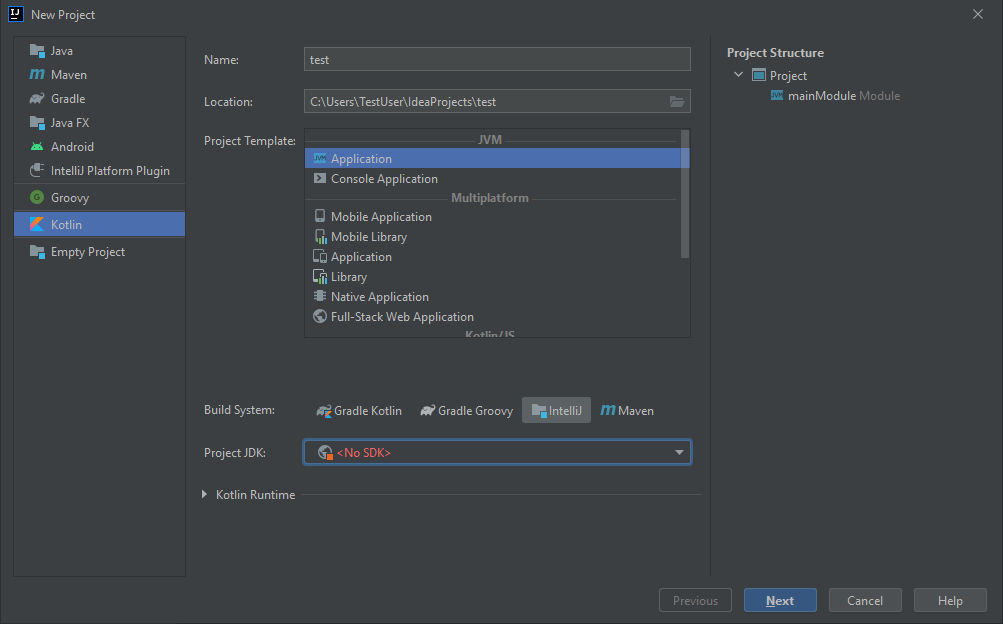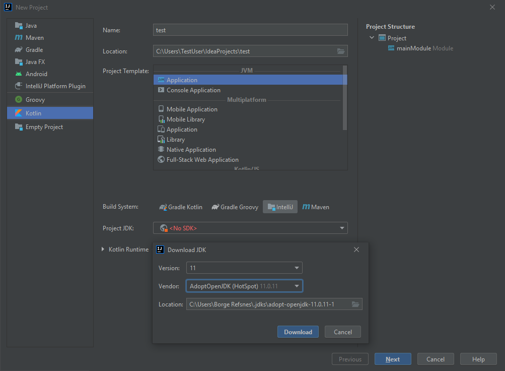 Next, we need to install something called JDK (Java Development Kit) to get our Kotlin project up and going. Click on the "Project JDK" menu, select "Download JDK" and select a version and vendor (e.g. AdoptOpenJDK 11) and click on the "Download" button: