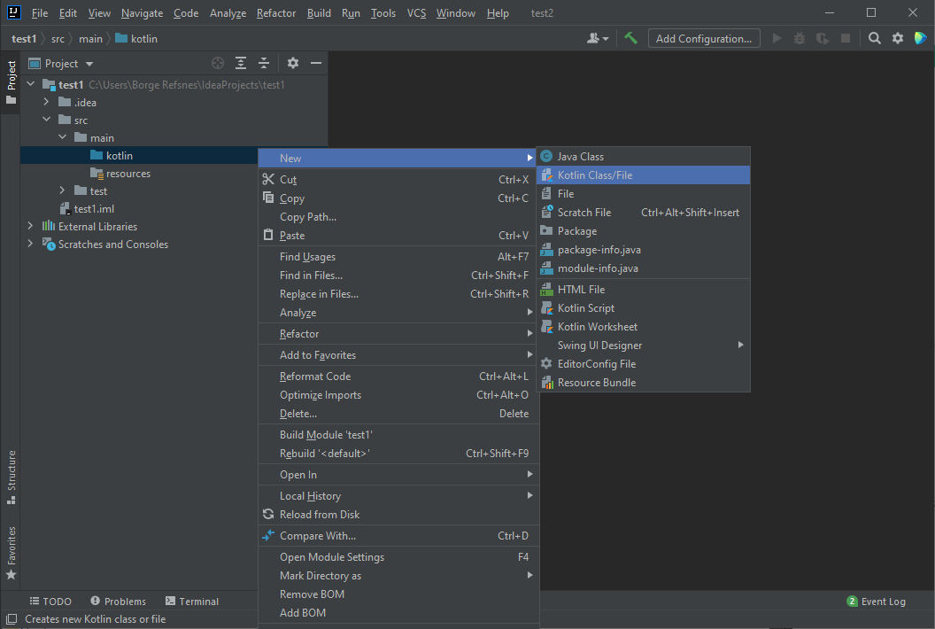 Now we can start working with our Kotlin project. Do not worry about all of the different buttons and functions in IntelliJ. For now, just open the src (source) folder, and follow the same steps as in the image below, to create a kotlin file: