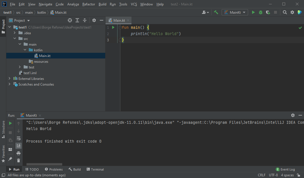 Next, IntelliJ will build your project, and run the Kotlin file. The output will look something like this: