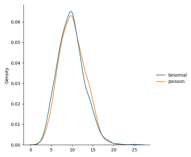 But for very large n and near-zero p binomial distribution is near identical to poisson distribution such that n * p is nearly equal to lam.