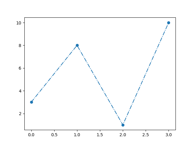 #Three lines to make our compiler able to draw: import sys import matplotlib matplotlib.use('Agg') import matplotlib.pyplot as plt import numpy as np ypoints = np.array([3, 8, 1, 10]) plt.plot(ypoints, 'o-.') plt.show() #Two lines to make our compiler able to draw: plt.savefig(sys.stdout.buffer) sys.stdout.flush()