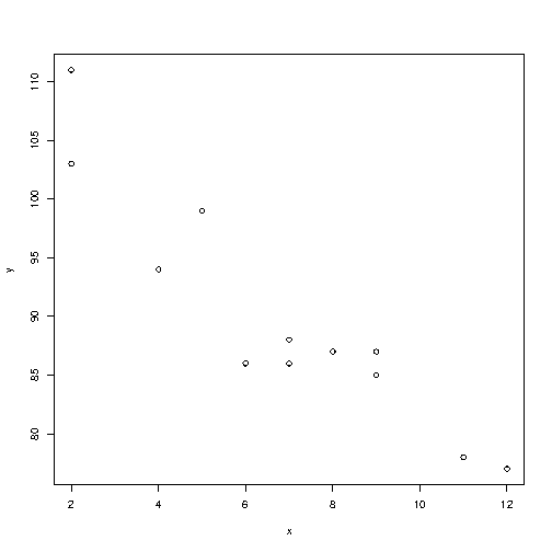 plot(x, y, main="Observation of Cars", xlab="Car age", ylab="Car speed")