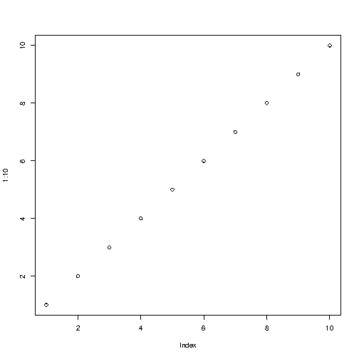 How you can use R to easily create a graph with numbers from 1 to 10 on both the x and y axis: