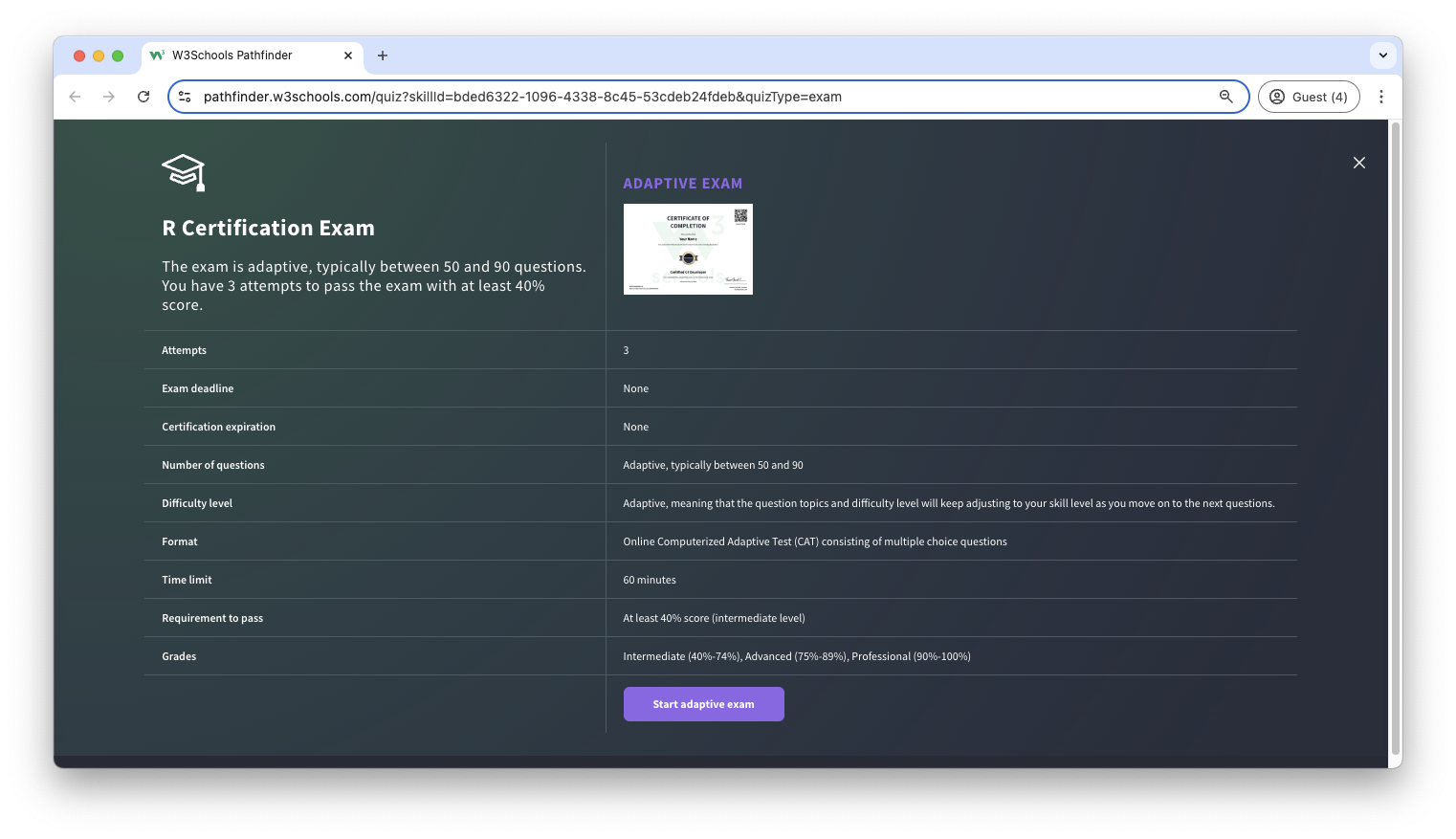 The adaptive certification exam is adaptive and graded; students will get a grade from intermediate, advanced to professional.