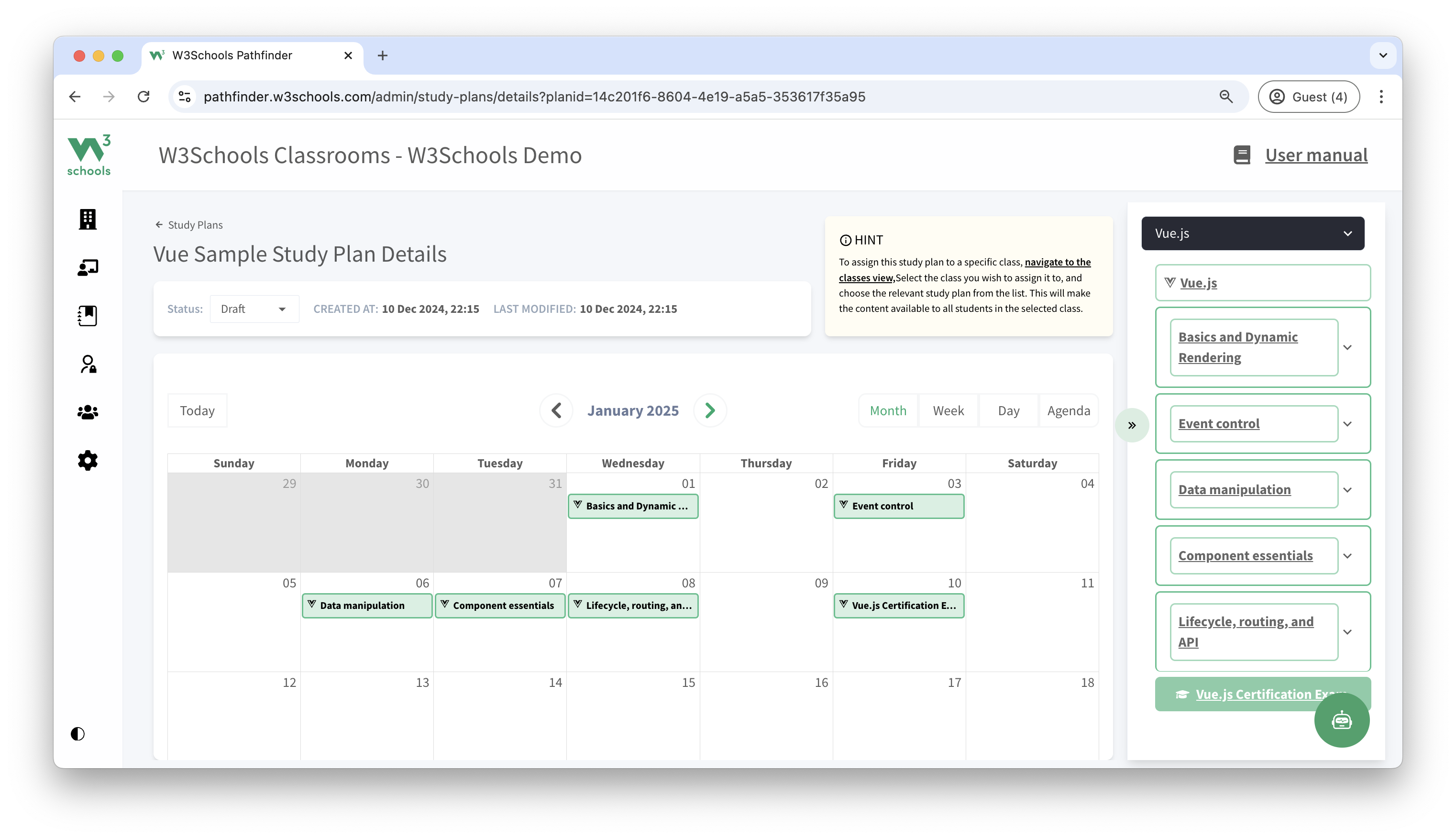 Save time with pre-built teacher materials and study plans. Easily organize your class with a timeline from the introduction of Vue to the final exam.